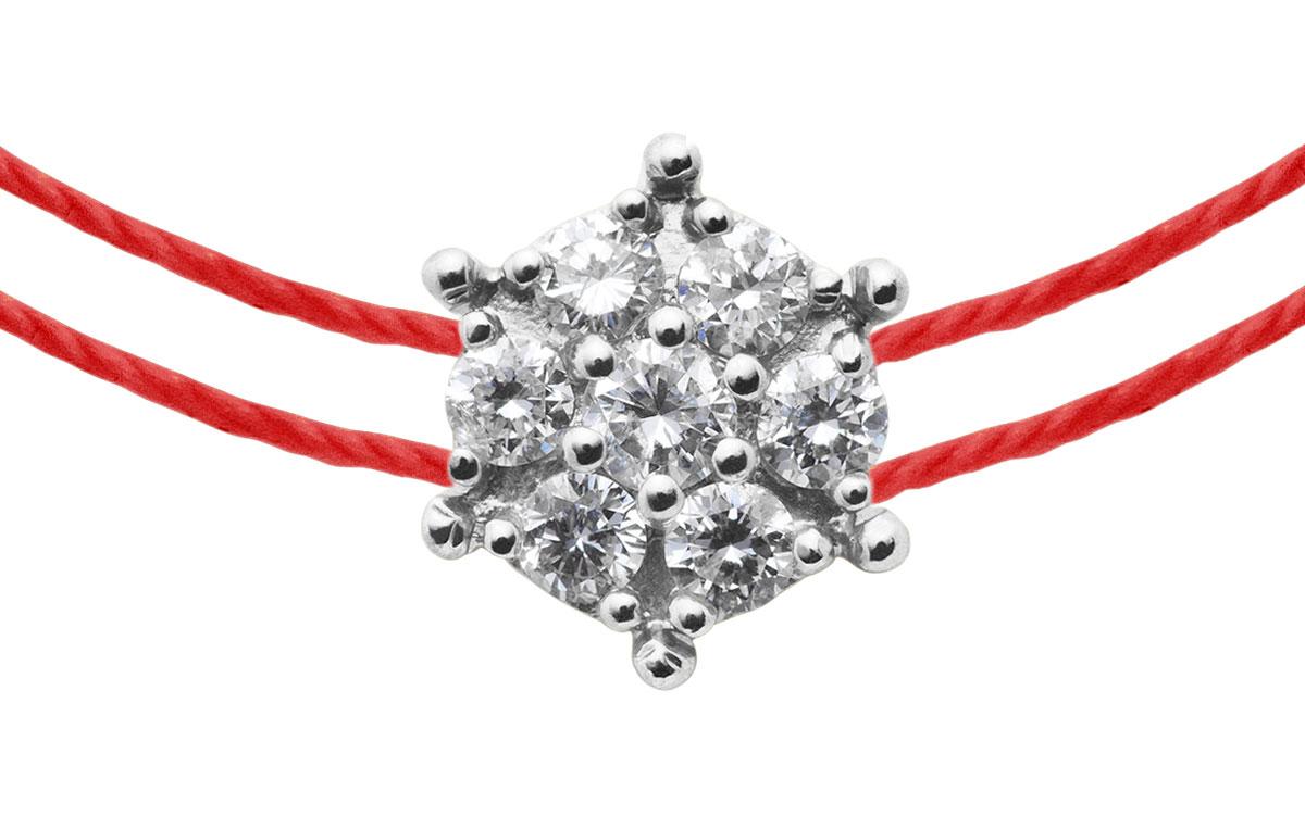 Inspired by jewellery of the past, RedLine designed the "Babette Collection". Seven diamonds for a grand total of 0.160 carats are mounted in an original and refined claw setting, making a starry profile. Two RedLine strings are interlaced for more combinations and more pleasure, adding delicacy to this sparkling bracelet at the same time. It comes in three colours of gold and in 80 string colours, and an 18K gold clasp and three linked rings make it adjustable.
