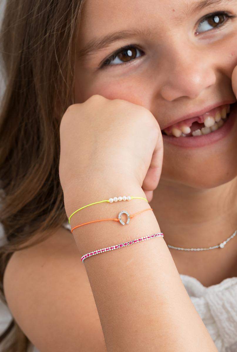 A horseshoe paved with 0.04 carats of diamonds brings you luck on this delicate and original RedLine string bracelet. Now available in three colours of gold and in 80 string colours, with adjustable size thanks to an 18K gold clasp and three linked rings.