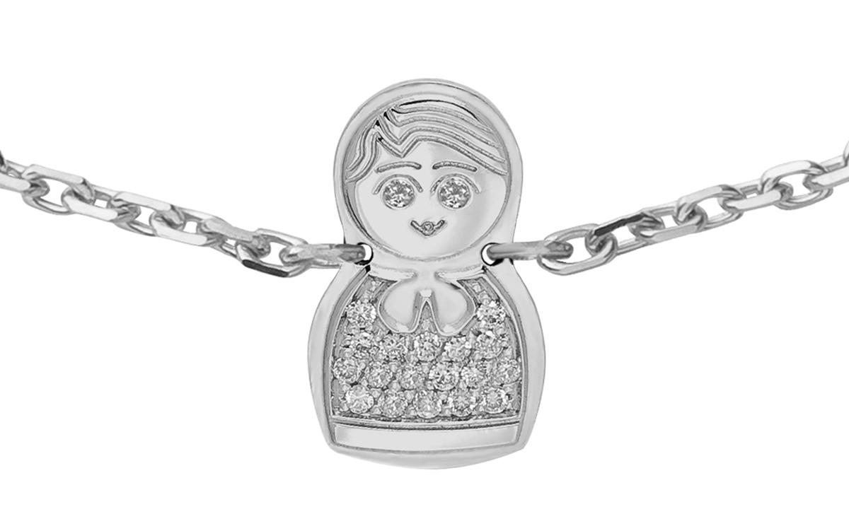 A pretty Russian doll paved with 0.20 carats of diamonds is the result when tradition is allied with refinement! Size-adjustable thanks to an 18K gold clasp and three linked rings, and it comes in white or yellow gold.