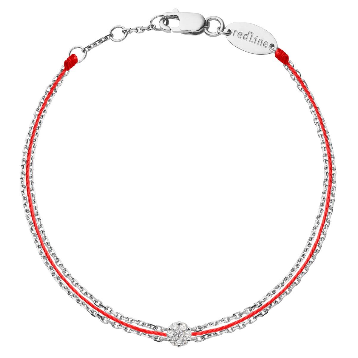 More than one eye will be fooled by the sparkle of 0.05 carats formed by seven diamonds mounted on a claw setting in this striking RedLine model. Two gold chains frame a coloured string upon which the diamonds proudly twinkle. An 18 carat gold clasp and three linked rings make the bracelet adjustable. It is available in white and yellow gold and in 80 string colours.